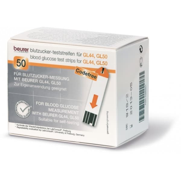 Allmänt:Testremsor 50 st (2×25 st) för mätning av blodsocker med Beurer GL44 och GL50 blodsockermätare. Specifikationer: Säkerhetsinformation: Tillverkarens namn: Beurer GmbH Tillverkarens adress: Söflinger Str. 218, 89077 Ulm, Germany Tillverkarens kontaktinformation: https://www.beurer.com/global/contact/ Tillverkarens webbadress: http://www.beurer.com Medföljer: 1 x Beurer GL44 -teststickor för blodsockermätare