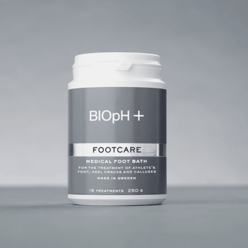 BIOpH Footcare är ett fotbad som effektivt reducerar symtomen vid fotsvamp, förhårdnader och hudsprickor/hälsprickor. När BIOpH Footcare blandas med vatten får det en rengörande och exfolierande effekt på huden och verkar för att ta bort bakterier, svamp och andra mikroorganismer. BIOpH Footcare är framtaget baserat på filosofin att inte i första hand tillsätta nya produkter på huden, utan snarare ta bort sådant som inte bör finnas där, och ge huden förutsättningar att reparera sig själv.Då BIOpH Footcare levereras i koncentrerad form undviker vi transporter av vätskor och därmed onödig miljöbelastning. Produkten är fri från parfym och konserveringsmedel, biologiskt nedbrytbar i naturen och tillverkad i Sverige. En förpackning à 250 gram räcker till 15 behandlingar.BIOpH+ Footcare är en medicinteknisk produkt