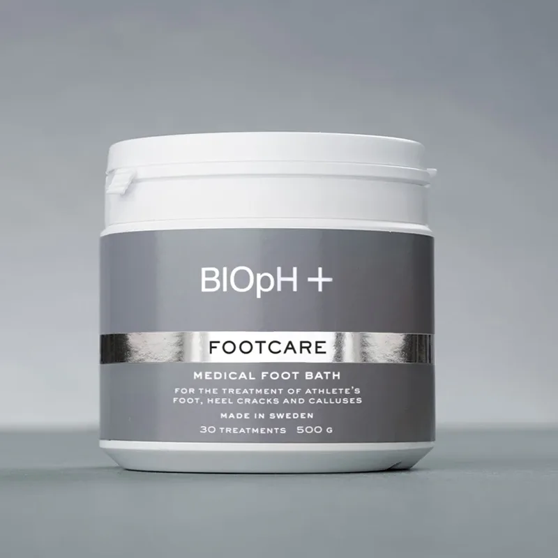 BIOpH+Footcare är ett medicinskt fotbad som behandlar fotsvamp, torra fötter, hälsprickor och förhårdnader. Behandlingen rengör på djupet genom exfoliering av döda hudceller och bidrar till att motverka att bakterier, virus och svamp fäster sig i huden. Formulan är tillverkad i Sverige och biologiskt nedbrytbar i naturen. Oparfymerad. Utan konserveringmedel. Finns i 250 gram och 500 gram.