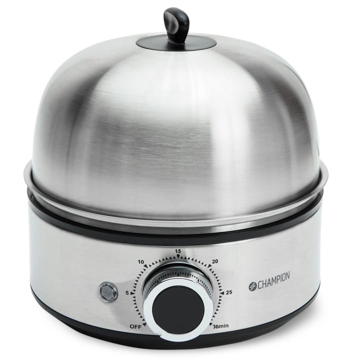 Champion äggkokare EB600 är framtagen med hälsan i fokus. Vi byter ut den traditionella plasten mot rostfritt stål för att du ska slippa koka dina ägg i onödig plast. Med äggkokarens timerfunktion ställer du enkelt in tiden du vill koka dina ägg så att du får äggen precis så som du vill ha dem, på endast 10-15 minuter är det perfekta ägget klart. När äggen är färdiga hörs ett pling, och apparaten stänger av sig själv automatiskt. Skölj av äggen i kallt vatten sedan är de redo att avnjutas. Specifikationer: – Effekt 400W – Kapacitet: 1-7 ägg – Timer: Upp till 30 min – Funktion: Signal när tillagning är klar – Automatisk avstängning – Skydd mot torrkokning – Medföljer: Mått med äggpickare – Sladdlängd: 87cm – Mått LxHxB: 18,1x17x16,8cm – Vikt: 631g Användarmanual EU-försäkran Produktblad