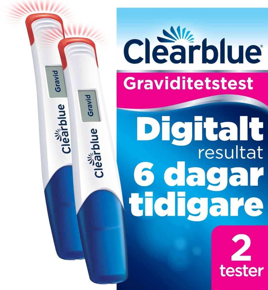 Vårt mest känsliga digitala graviditetstest tar du själv hemma och kan användas från sex dagar före din uteblivna menstruation. (1) 78 % av “Gravid”-resultaten kan detekteras 6 dagar före utebliven mens (vilket är 5 dagar innan förväntad mens). Testets känslighet är 10 mIU/ml. Testet utförs enkelt tack vare en extra bred spets och vår unika stoppljusfunktion, som blinkar så att du vet när tillräckligt med urin samlats in. Dessutom gör vår Floodguard (TM)-teknologi det lätt att testa rätt. Testet tar 1-5 minuter och medan det pågår visar en nedräkning (Smart Countdown (TM)) på skärmen hur lång tid som återstår tills det digitala resultatet skrivs ut i klarttext på skärmen . Alla graviditetstester från Clearblue är över 99 % tillförlitliga från dagen då du väntar din mens.
