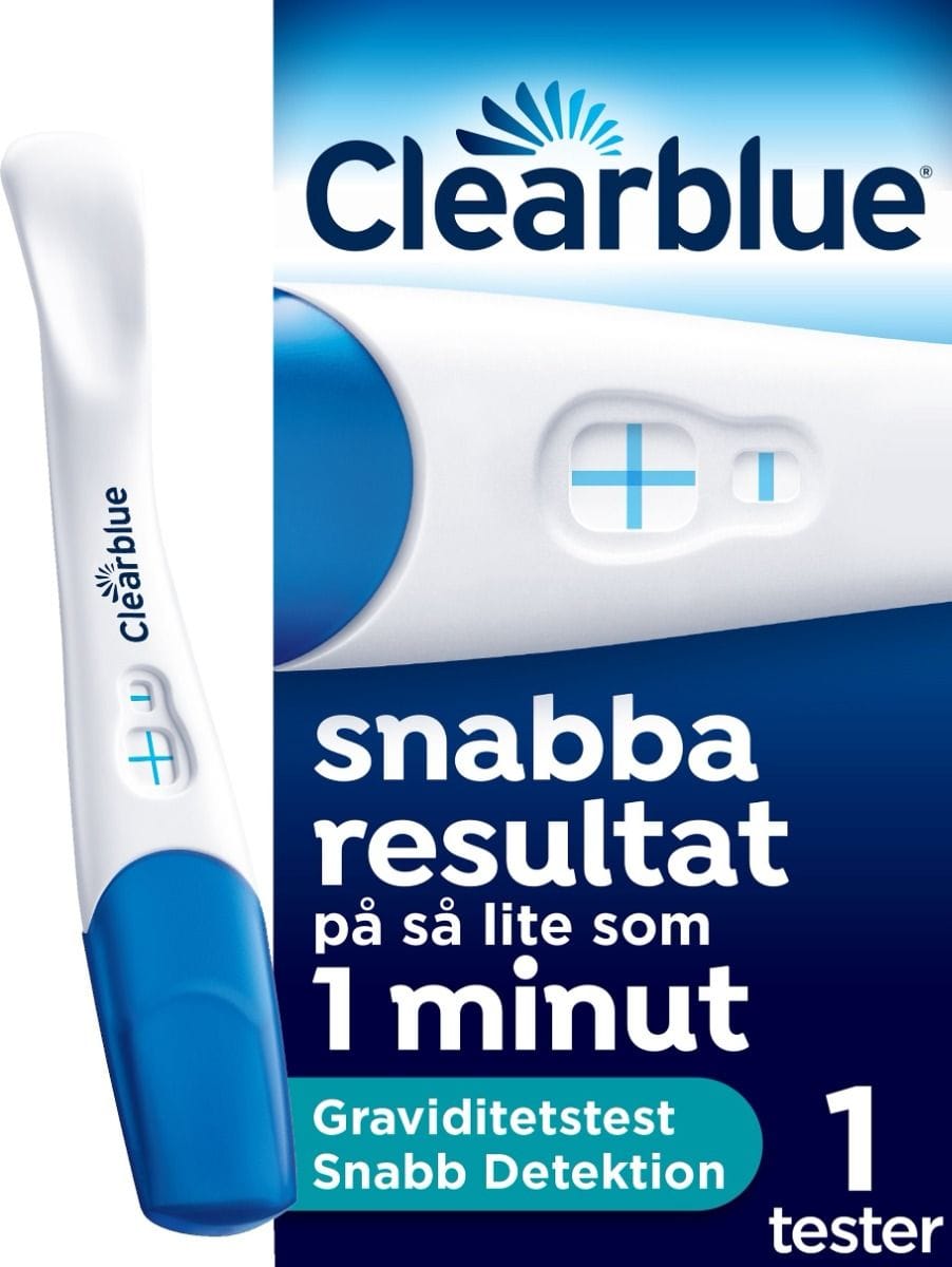 Clearblue Snabb Detektion Graviditetstest kan ge dig ett “Gravid”-resultat så snabbt som efter 1 minut när du testar från dagen med missad mens. Du bör vänta i 3 minuter för att bekräfta ett “Inte Gravid”-resultat. Det är utformat för att vara det allra enklaste graviditetstestet för hemmabruk med en extra bred färgändrande spets och ett ergonomiskt böjt handtag. Graviditetstestkitet för hemmabruk ger den precision du förväntar dig av Clearblue och är över 99 % tillförlitligt från dagen du väntar din mens. I en brittisk studie uppgav fler än 9 av 10 kvinnor att de var villiga att betala mer för Clearblue Snabb Detektion än för ett så kallat remstest (baserat på 111 kvinnor som använde och läste av olika typer av test). Om du vill ha mer information om produkten eller behöver få svar på frågor kan du kontakta vår rådgivning måndag till fredag mellan 09.00 och 12.00.