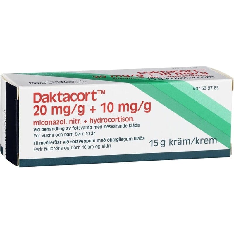 Daktacort Kräm 20 mg/g + 10 mg/g är ett läkemedel som används för att behandla hudinfektioner orsakade av svamp och bakterier. Den kombinerade formulan innehåller två aktiva ingredienser: mikonazol (20 mg/g) och hydrokortison (10 mg/g). Mikonazol är ett svampdödande medel som effektivt bekämpar infektioner orsakade av jästsvamp och andra svampar, medan hydrokortison är ett kortisonpreparat som lindrar inflammation och irritation, såsom rodnad, klåda och svullnad.Daktacort används vid behandling av svampinfektioner på huden, såsom fotsvamp, ringorm eller hudinfektioner som orsakas av svamp och som åtföljs av inflammation. Den smidiga krämen absorberas snabbt och ger både svampdödande effekt och lindring av besvärande symtom.Behandlingen innebär att krämen appliceras på det drabbade området 1–2 gånger om dagen. Fortsätt behandlingen enligt rekommendationer även om symtomen försvinner innan kuren är avslutad, för att förhindra återfall. Daktacort kräm ska användas på intakt hud och bör inte appliceras på öppna sår eller på känsliga hudområden utan läkares rekommendation.Det är viktigt att följa doseringsanvisningarna och att inte använda Daktacort längre än rekommenderat, särskilt vid långvarig användning av kortison. Om symtomen inte förbättras efter några dagar eller om infektionen återkommer ofta, bör läkare kontaktas för vidare utvärdering.