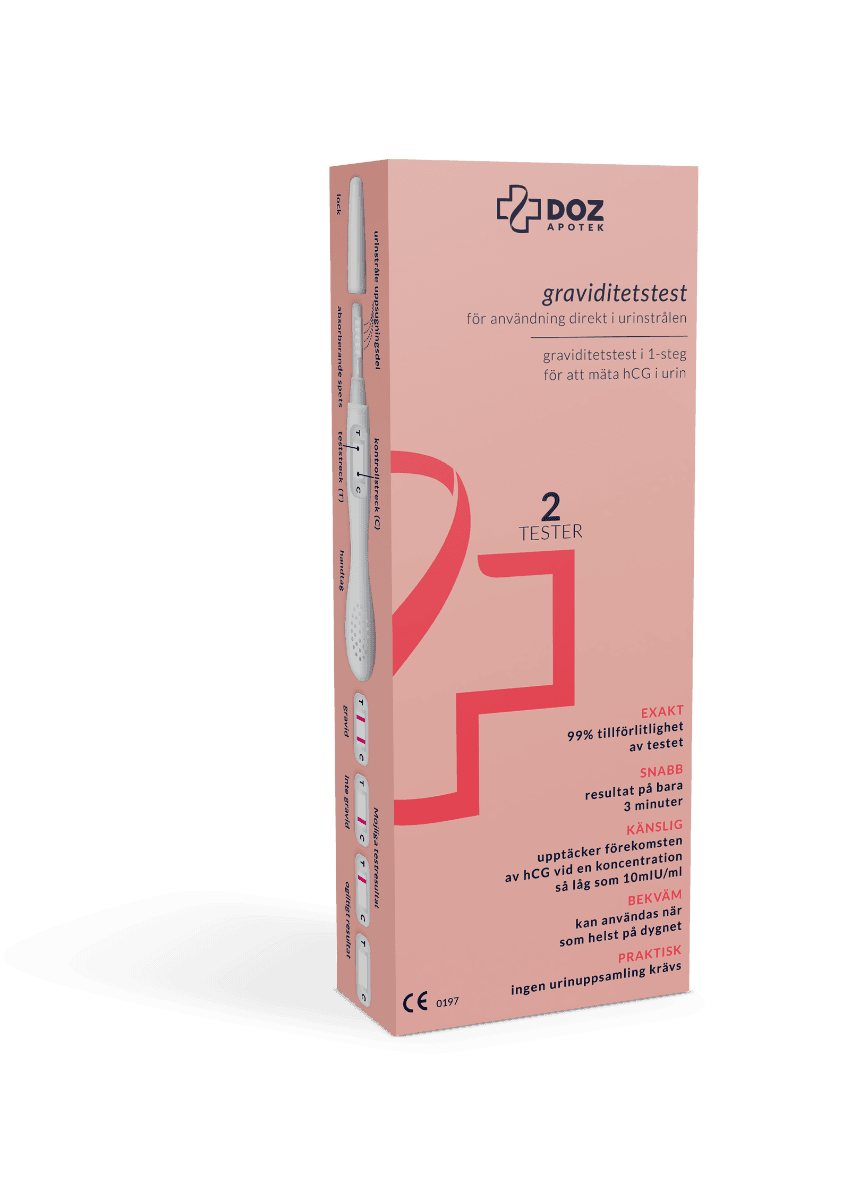 DOZ Apotek graviditetstest för användning direkt i urinstrålen. 2 tester.