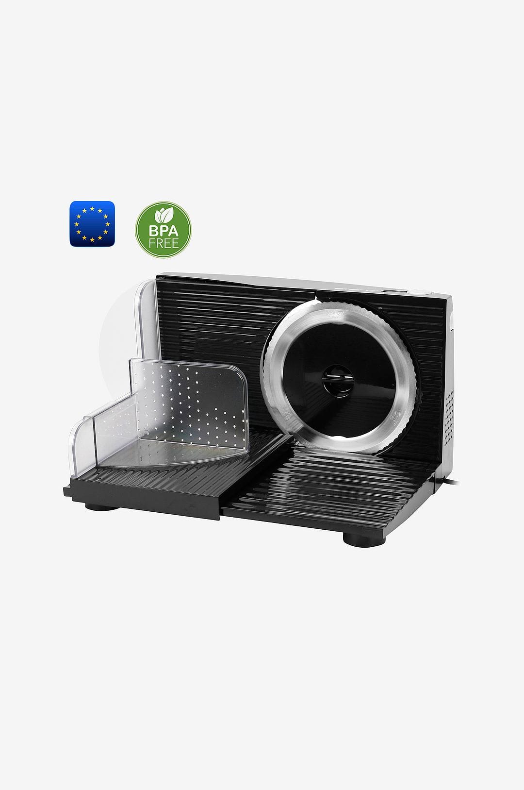 Kraftfull och funktionell skärmaskin som säkert och tyst skär perfekta skivor, oavsett tjocklek eller vad som ska skäras. Du får enkelt och snabbt snygga och raka skivor av kött, bröd, grönsaker etc. klinga av rostfritt stål och justerbar skivstorlek mellan 0-17 mm. står stadigt med gummifötter på undersidan. specifikationer: effekt 100 w. klinga 165 mm. snabbstartknapp. säkerhetsbrytare. vikbar för optimal förvaring. justerbar hastighet. matningsbricka med tum-skydd. smart sladdförvaring. bpa-fri.