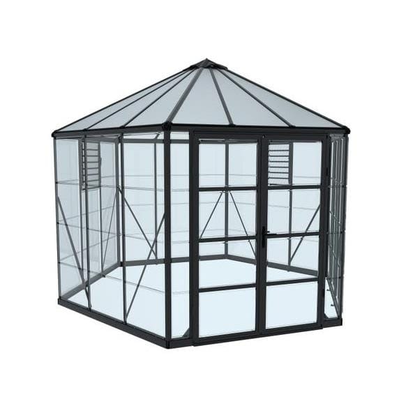Palram Oasis är ett hexagonalt växthus i elegant och underhållsfri design. Växthuset har gör-det-själv-montering med monteringssystem med glidande paneler (utan glaslåsande delar), enhetliga profiler till alla ställningar och steg-för-steg-manual.