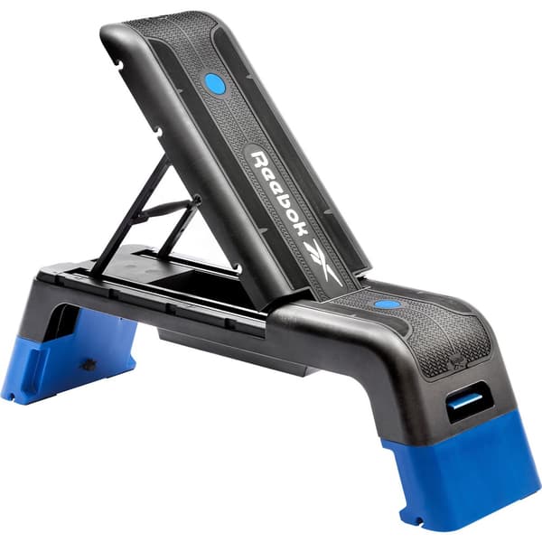 Reebok Deck blue är en multifunktionell träningsenhet som kan användas som steg- och träningsbänk. Reebok Deck är en helt anpassningsbar plattform med lutning, nedgång och platt bänk. Ryggstödet är justerbart i fyra lägen med snabbskjut- och låssystem. Höjden på Reebok Deck är också justerbar i två nivåer, 20 och 35 cm. Reebok-däcket har fästpunkter för motståndsband och ett fack för förvaring av mindre träningsutrustning. Träningsytan på detta Reebok Deck är strukturerad för bra grepp och har visuella målzoner. De halkfria gummifötterna hjälper till att absorbera stötar och ger en solid, stabil träningsplattform. Reebok Deck är lätt och därför lätt att flytta och förvara, men ändå är Reebok Deck solid och robust nog att tåla de tuffaste träningarna. För att hjälpa dig komma igång med Reebok Deck har du tillgång till gratis träningsvideor online.