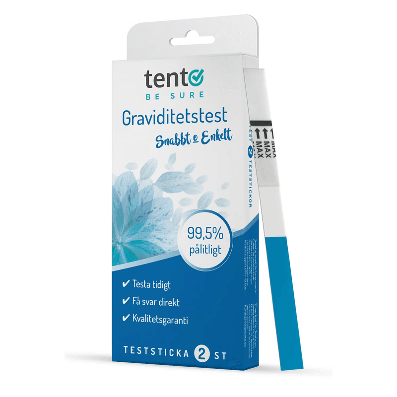Med Tento Graviditetstes kan du få en indikation på om du är gravid redan 7 dagar efter befruktning!Teststickan är enkel att använda och är 99,5% pålitlig. Fördelen med dessa teststickor är att de är en av marknadens bredaste (6mm) vilket gör det lättare att avläsa resultatet jämfört med en smal sticka. Att använda en teststicka för att graviditetstesta sig är lika enkelt som andra metoder.Hög känslighet för tidig graviditetTeststickan har hög känslighet för hormonet hCG (Humant Choriogonadotropin) och kan därför lätt fånga upp den låga koncentrationen på enbart 25 mI/ml hCG som krävs för att bekräfta en graviditet. Kroppens hCG-produktion påbörjas kort efter att befruktningen har ägt rum. I enlighet med många laboratorier är gränsen på 25Im/ml hCG tillräckligt pålitlig för att påvisa en graviditet, men lägre koncentrationer av hCG är inte tillräckligt för att säkerställa en graviditet.Säkert graviditetstest – 99,5 % säkerhetGraviditetsstickan är konstruerad för att enbart reagera på äkta graviditet, dvs. den reagerar enbart om hCG kan påvisas. Detta utesluter därmed att falska testresultat visas och förhindrar att stickan reagerar på hormonet LH som förekommer naturligt i kroppen under ägglossning.Lättanvänt graviditetstestBifogad manual på svenska ger dig all information som du behöver för att använda teststickan på rätt sätt. Vid eventuella frågor är du välkommen att ta kontakt med oss via kundtjänst.Säker förpackningGraviditetsstickan omges av en folieförpackning som dessutom är fuktskyddad och garanterar att stickan är säker att användas när förpackningen bryts. Graviditetsstickan är försedd med CE-märkning (enligt IVD-direktivet).